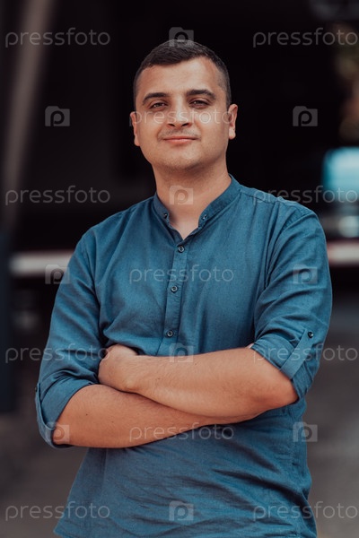 Успешный молодой бизнесмен в рубашке, скрестив руки, позирует на открытом воздухе с уверенным выражением лица