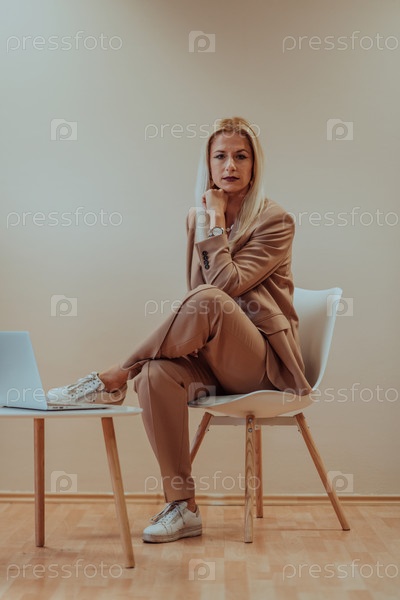 Профессиональная бизнес-леди сидит на стуле на спокойном бежевом фоне, усердно работая на своем ноутбуке, демонстрируя преданность делу и сосредоточенность на достижении успеха