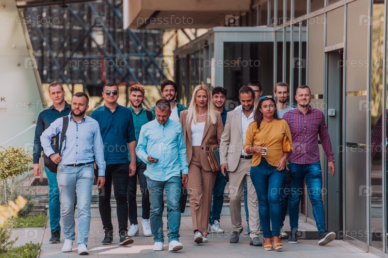 Группа бизнесменов и коллег из разных слоев общества прогуливается по своему рабочему месту, демонстрируя сотрудничество и командную работу в компании
