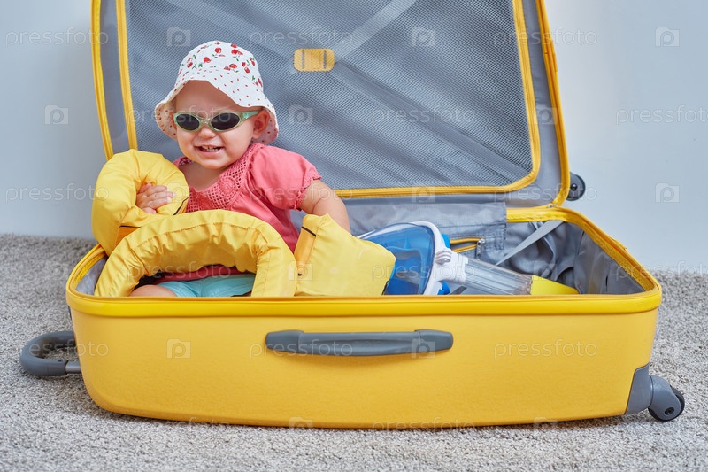 Веселый ребенок-турист в желтом чемодане. Собирает вещи для поездки, путешествия и отпуска