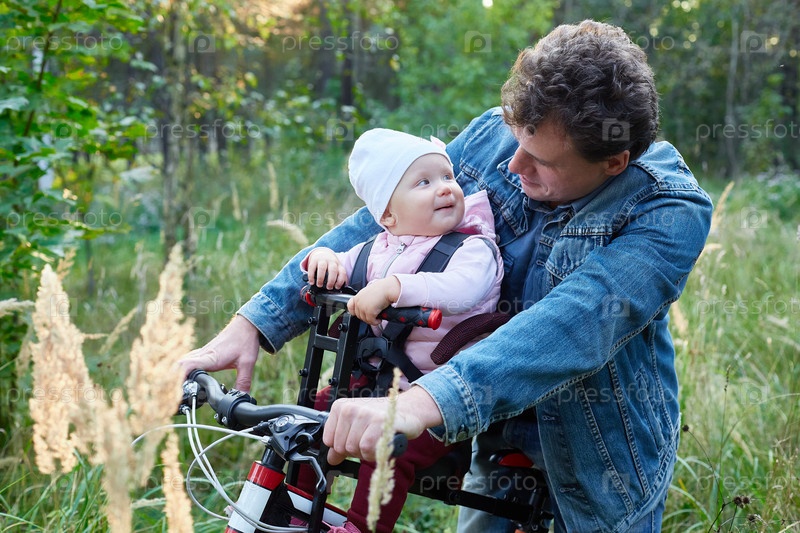 Малышка сидит в велосипедном кресле, а ее отец с велосипедом. Семья и поездка на выходные
