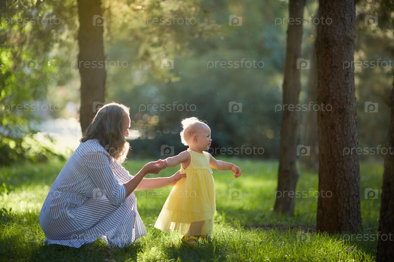 Мать и дочь гуляют в солнечном летнем лесу