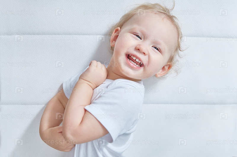 Маленький ребенок в белой одежде счастливо смеется, лежа на белом матрасе в спальне