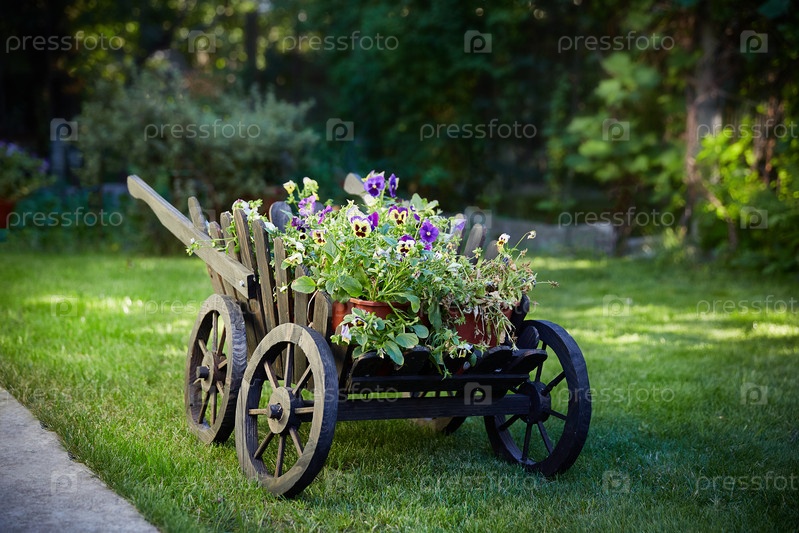Декор старого английского сада. Старинная деревянная тележка, используемая как инсталляция с цветочными горшками в сельской местности, арт-объект с цветами в деревенском стиле