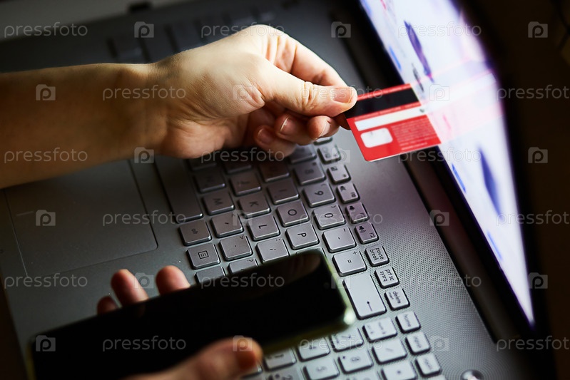Безликая женщина засовывает кредитную карту в его ноутбук. Юмористическая концепция онлайн-покупок и электронной коммерции