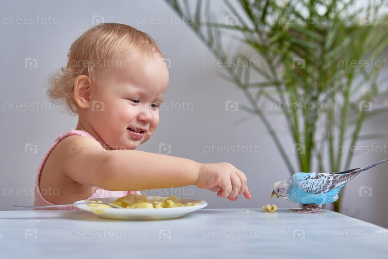 Ребенок кормит волнистого попугайчика из своей тарелки