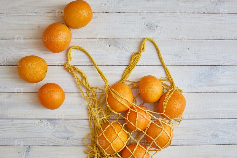 Вид сверху на свежие апельсины в авоське на белом деревенском фоне