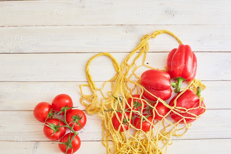 Пакет с помидорами и перцем на деревянном фоне с местом для копии