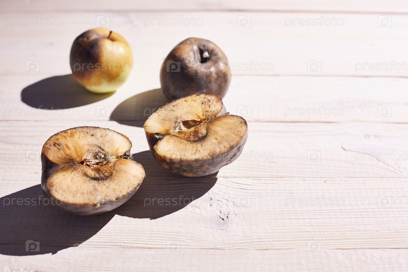 Гнилые яблоки лежат на деревянной поверхности под лучами яркого солнца. Проблема испорченных продуктов