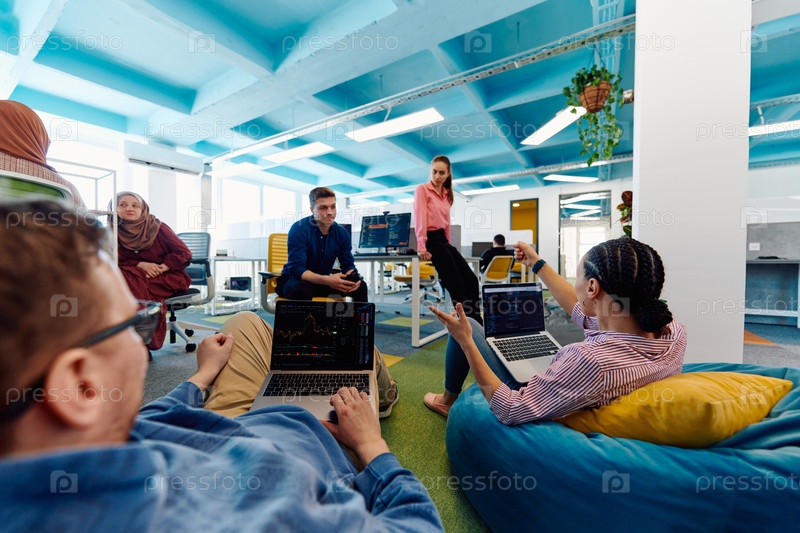 В современном офисе стартапа разнообразная группа молодых и способных бизнесменов ведет оживленные обсуждения различных проектов, демонстрируя командную работу, инновации и предпринимательский дух