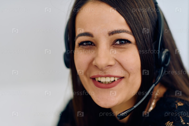 Дружелюбный агент колл-центра отвечает на входящие звонки с помощью гарнитуры и обеспечивает удаленное обслуживание клиентов