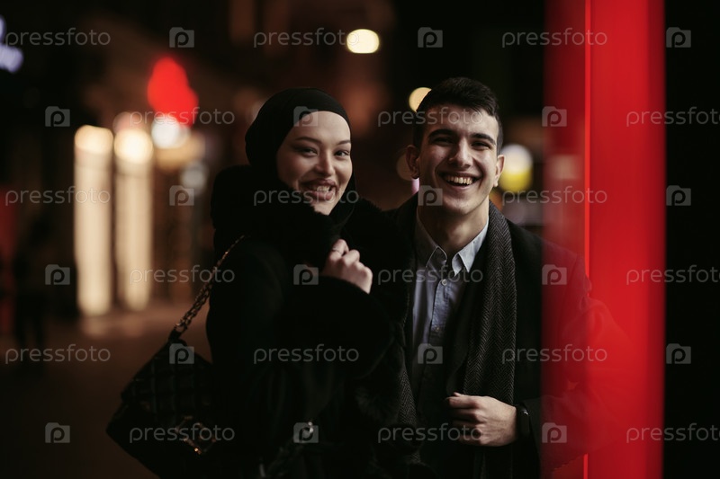 Счастливая мультикультурная деловая пара прогуливается вместе на улице города ночью возле витрины ювелирного магазина