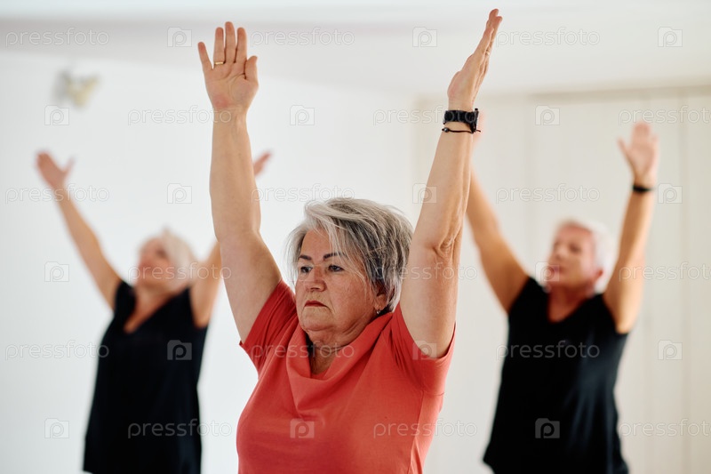 Группа пожилых женщин занимается различными упражнениями йоги, включая растяжку шеи, спины и ног, под руководством тренера в залитом солнцем месте, способствуя благополучию и гармонии
