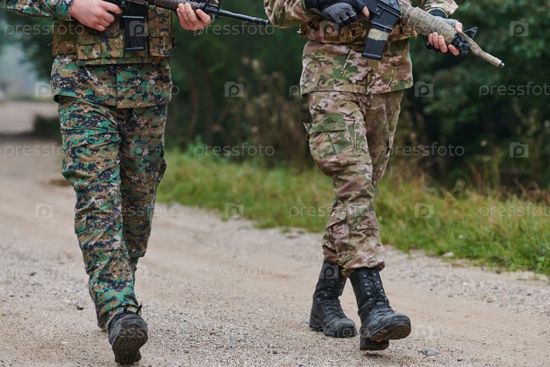 Фотография крупным планом: крепкие ноги элитных солдат, одетых в камуфляжные ботинки, целеустремленно шагают по опасной лесной тропе, отправляясь на ответственную военную миссию