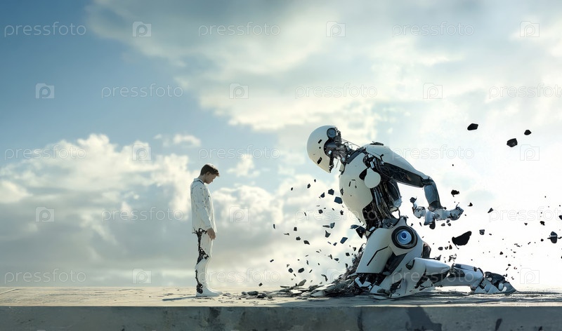 Человек, пытающийся уничтожить современные технологии и предотвратить появление роботов и искусственного интеллекта. Сгенерированное изображение