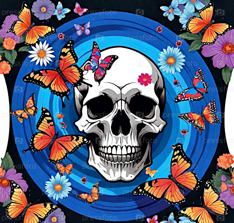 Стилизованный череп с цветами и бабочками ИИ