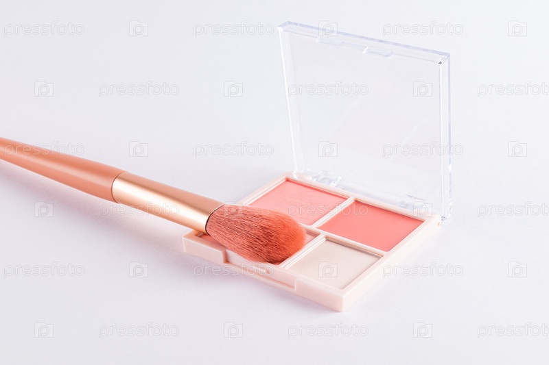 Открытая упаковка красивых нежных румян и кисточка для макияжа, лежащая на них на белом фоне. Концепция декоративной косметики и красоты