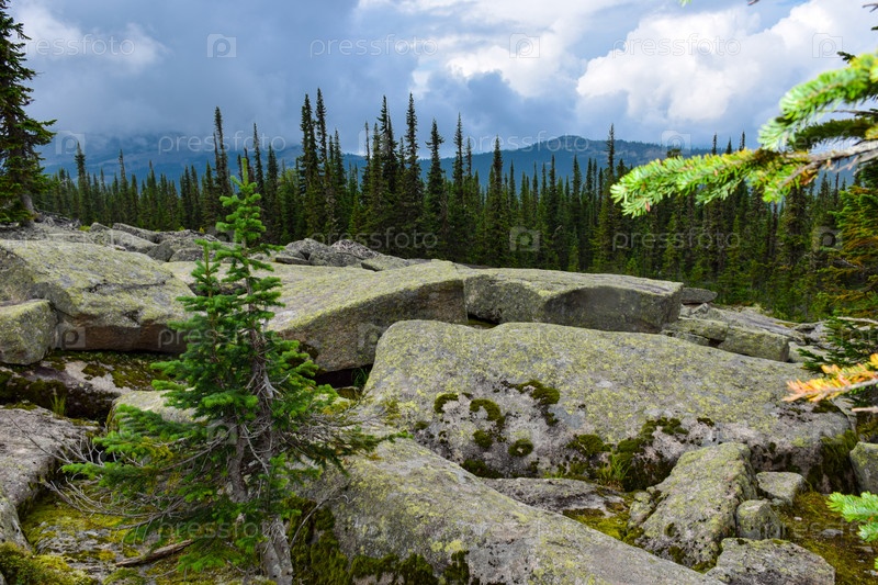 Горный пейзаж, Ергаки, лето, мегалиты, горная тайга, каменный город, небо, тучи