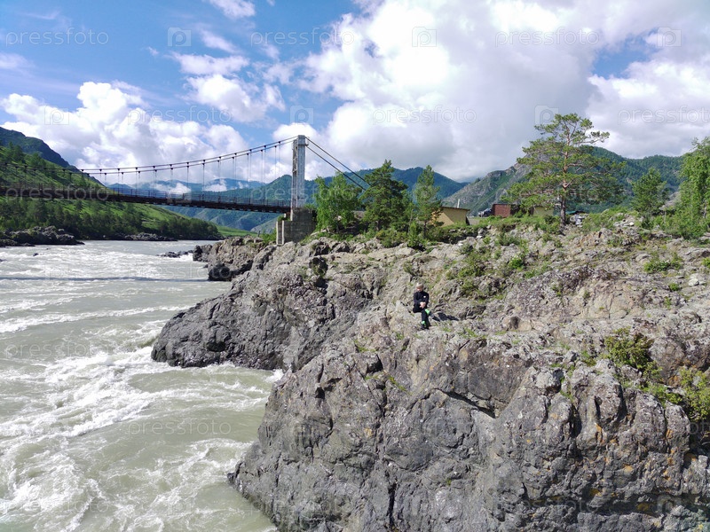 Ороктойский мост, автомобильный висячий мост. Река Катун, Чемальский район, Республика Алтай. Горный Алтай. (2024 г.) Снимок из квадрокоптера, высота птичьего полета. Красивый пейзаж. Мост Орокто, автоподвесной мост. Река Катун, Чемальский район