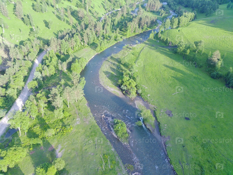 Река Чемал в районе Форелевой фермы. Видео с квадрокоптера (дрона) в подъеме. Ясный день в горном Алтае. Республика Алтай, Россия. Июнь 2024 г. Река Чемал в районе Форелевого хозяйства. Видео с квадрокоптера (дрона) на подъеме. Ясный день в Горном Алтае.