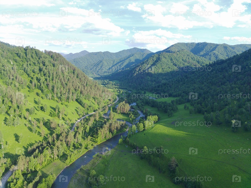 Река Чемал в районе Форелевой фермы. Видео с квадрокоптера (дрона) в подъеме. Ясный день в горном Алтае. Республика Алтай, Россия. Июнь 2024 г. Река Чемал в районе Форелевого хозяйства. Видео с квадрокоптера (дрона) на подъеме. Ясный день в Горном Алтае.