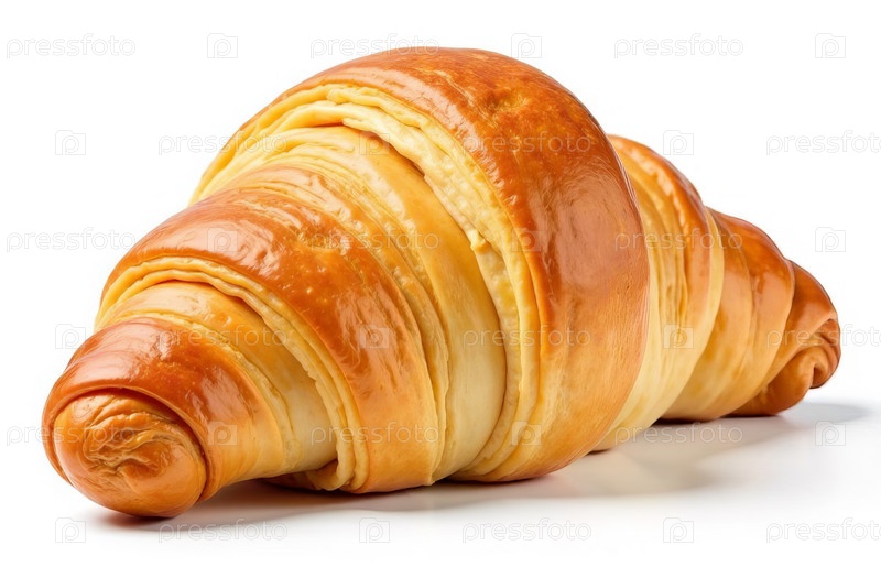 Аппетитный золотистый круассан крупным планом на белом фоне. Выпечка для утреннего завтрака или перекуса