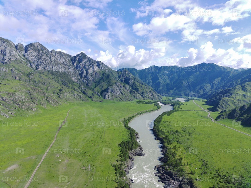 Река Катунь, Республика Алтай, Горный Алтай, Россия. Фотография с квадрокоптера с высоты