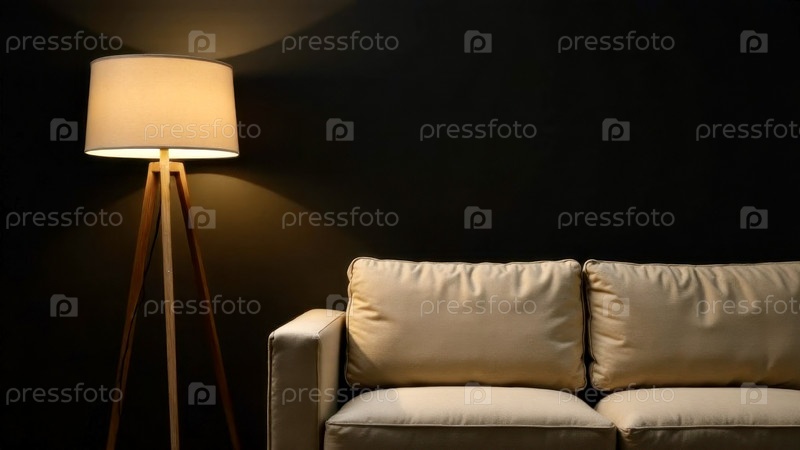В темной комнате бежевый диван, рядом с ним торшер. На стене есть место для копирования