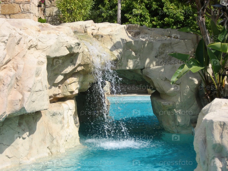 Роскошный бассейн отеля с водопадом с бирюзовой водой