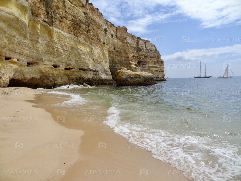 Прибрежный пейзаж с песчаным пляжем, скалистыми утесами и парусниками на фоне спокойного моря под частично облачным небом. Концепция красоты природы