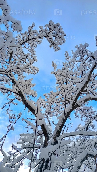Причудливо изогнутые ветви деревьев, усыпанные снегом на фоне голубого неба