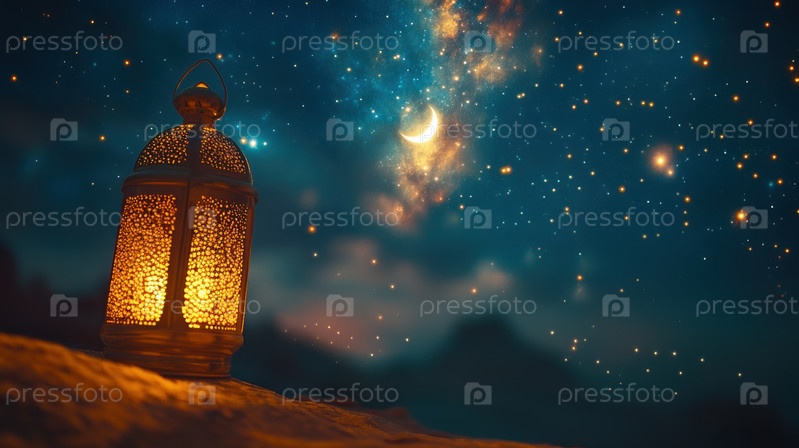 Традиционный фонарь Рамадана стоит на песке в пустыне на фоне звездного неба
