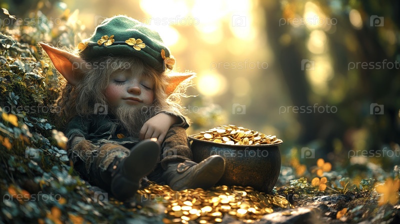 Уставший лесной эльф спит в лучах солнца среди листвы, рядом с ним стоит горшочек с золотыми монетами