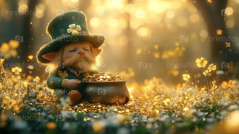 Лесной гном, уставший после поисков, спит, сидя с горшком золотых монет в руках