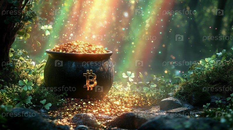 Волшебный горшочек под радугой в лучах солнца в сказочном лесу, наполненном золотыми биткоинами