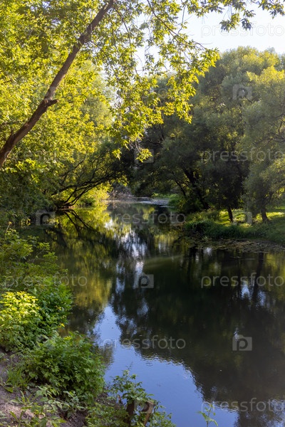Живописный лесной пейзаж с деревьями и рекой в солнечный летний полдень. Красота в природе