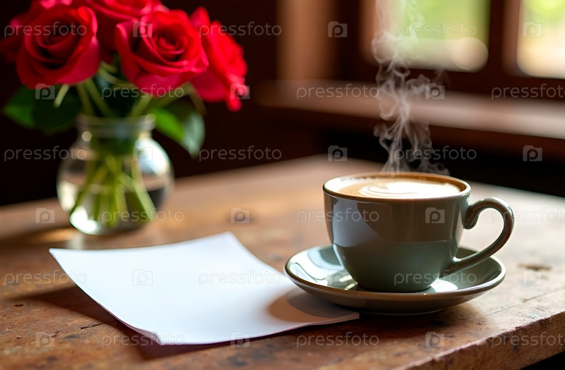 Композиция с чашкой горячего кофе, букетом красных роз и чистым листом для заметок на деревянном столе в минималистичном деревенском стиле. Макет для текста