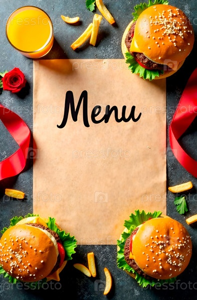 Текстурная бумага с рукописным текстом Меню ко Дню Святого Валентина для ресторанов быстрого питания с бургерами, апельсиновым соком, картофелем фри, украшенное красными розами, лентой