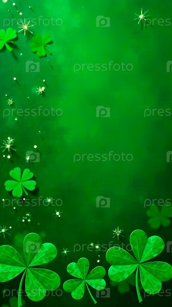 Зеленый вертикальный фон украшен клеверными трилистниками по низу. Рамка с местом для копирования. День Святого Патрика