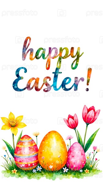 Пасхальная открытка с разноцветными яйцами и весенними цветами. акварель на белом фоне. надпись Happy Easter