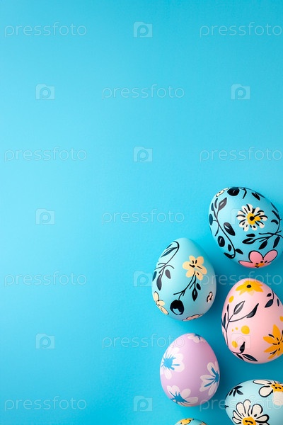 Пасхальный голубой фон с пасхальными яйцами, креативно расписанными черными и цветными цветами. Баннер с местом для копирования, для текста