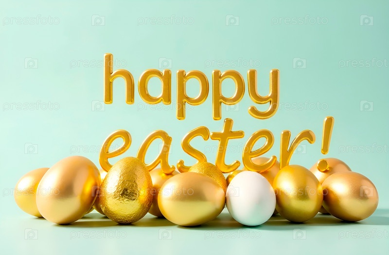 Баннер с золотыми буквами в нижнем регистре Счастливой Пасхи и золотых яиц. Открытка, постер. Ювелирные изделия, драгоценности