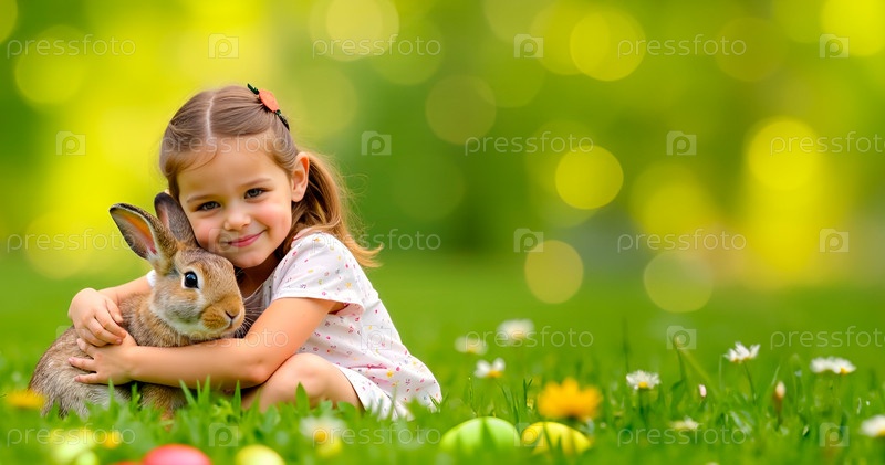 Маленькая девочка обнимает кролика, сидя в зелени среди цветов и пасхальных яиц. Пасхальный баннер с местом для текста