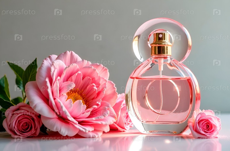 Стеклянный флакон для духов в форме цифры 8 и розовых цветов в честь Международного женского дня