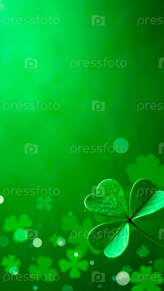 Яркий светящийся зеленый фон украшен трилистником клевера внизу. Рамка с местом для копирования. День Святого Патрика
