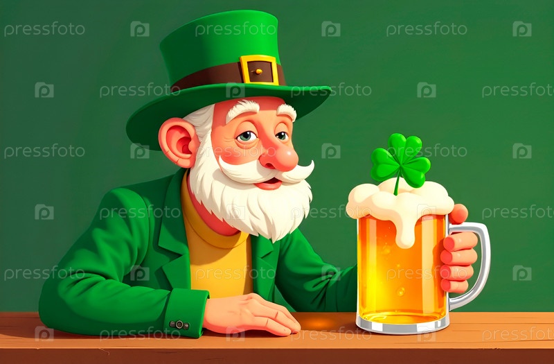 Лепрекон в зеленом костюме и цилиндрической шляпе с кружкой пива в руке и трилистником клевера. День Святого Патрика