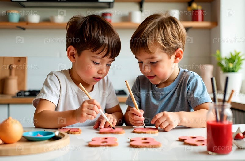 Дети раскрашивают печенье пищевыми красителями, готовя сюрприз маме на 8 марта