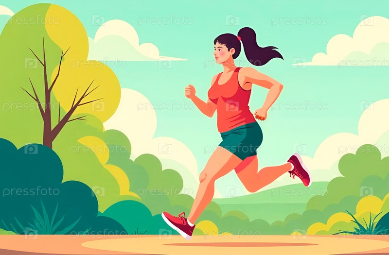 Полная молодая женщина бегает трусцой в летнем парке. Борьба с лишним весом, диеты, здоровый образ жизни