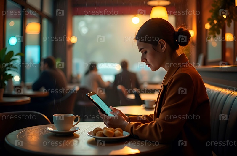 Молодая женщина с уложенными волосами читает электронную книгу вечером в кафе