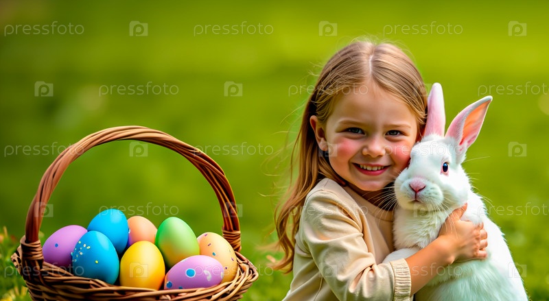 Маленькая девочка обнимает кролика, сидящего в зелени рядом с корзиной пасхальных яиц. Пасхальная открытка с местом для текста